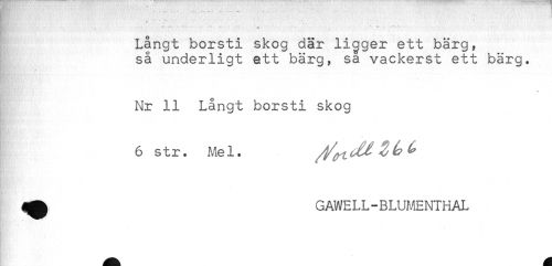 //// ** ... , ^ .. //// Långt borsti skog där ligger ett bärg, //// så underligt ett bärg, sa vackerst ett bärg. //// Nr 11 Långt borsti skog //// 6 str. Mel. //// ^ GAWELL-BLUMENTHAL ////