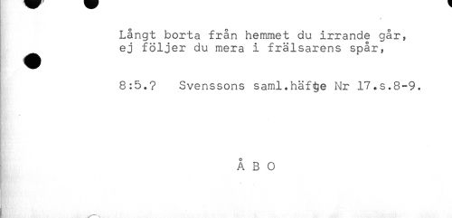 //// Långt borta från hemmet du irrande går, //// ^^ ej följer du mera i frälsarens spår, //// 8:5.? Svenssons saml.häf^e Nr 17.s.8-9. //// ÅBO //// t //// ] ////