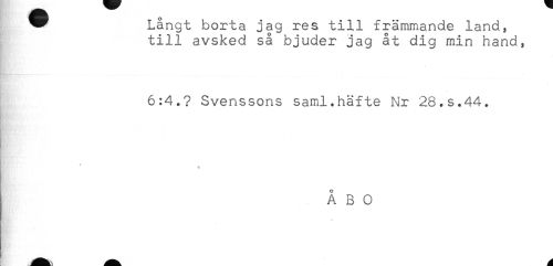 //// * Långt borta jag res till främmande land, //// till avsked så bjuder jag åt dig min hand, //// * //// 6:4.? Svenssons saml.häfte Nr 28.S.44. //// * //// * //// ÅBO ////