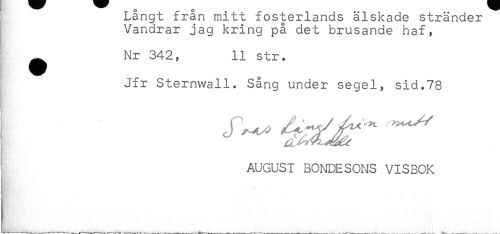 //// j Långt iran mitt iosterlands alskade stränder //// j Vandrar jag kring på det brusande haf, //// I ^ Nr 342, 11 str. //// Jfr Sternwall. Sång under segel, sid.78 //// i AUGUST BONDESONS VISBOK ////