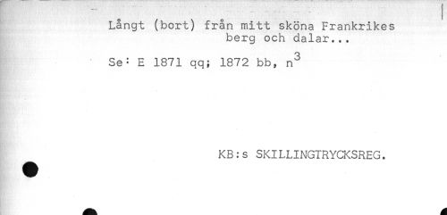//// Långt (bort) från mitt sköna Frankrikes //// berg och dalar... //// ' Se^ E 1871 qq; 1872 bb, n^ //// % //// ^ KB:s SKILLINGTRYCKSREG. ////