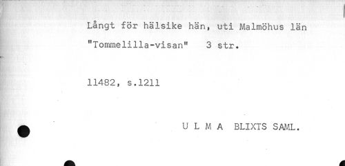 //// Långt för hälsike hän, uti Malmöhus län //// "Tommelilla-visan" 3 str. //// 11482, s.1211 //// ^ U L M A BLIXTS SNAL. ////
