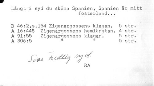 //// Långt i syd du sköna Spanien, Spanien är mitt //// fosterland... //// B 46:2,s.154 Zigenargossens klagan. 5 str. //// A 16:448 Zigenargossens hemlängtan. 4 str. //// A 91:55 Zigenargossens klagan. 5 str. //// A 306:5 " " 5 str. //// RA ////