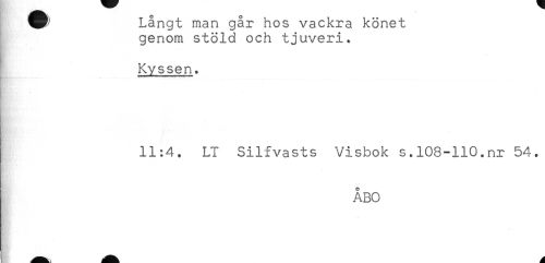 //// ^^ Långt man går hos vackra könet //// genom stöld och tjuveri. //// K' //// ! Kyssen. //// - //// ! ' //// 11:4. LT Silfvasts Visbok s.108-110.nr 54. //// ÅBO ////
