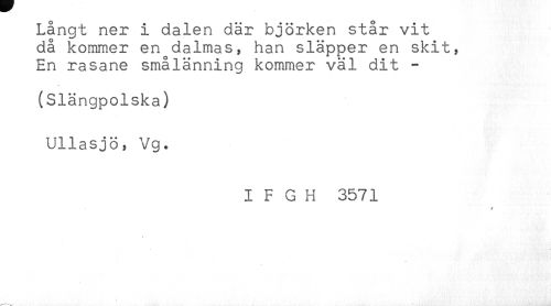 //// Långt ner i dalen där björken står vit //// då kommer en dalmas, han släpper en skit, //// En rasane smålänning kommer väl dit - //// (Slängpolska) //// Ullasjö, Vg. //// I F G H 3571 //// * ////