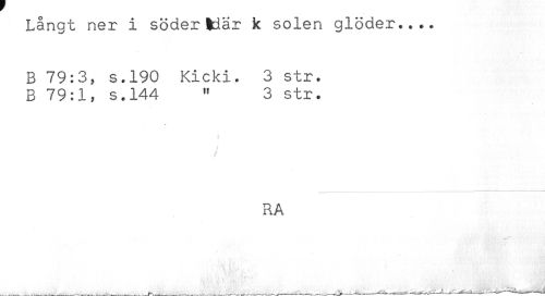 //// Långt ner i söder Här k solen glöder.... //// B 79:3, s.190 Kicki. 3 str. //// B 79:1, s.144 " 3 str. //// RA //// ^ ____ -_— ___—-____—_-------— ////