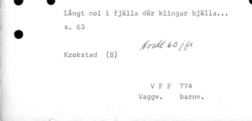 //// t //// Långt nol i fjälla där klingar bjälla... //// - //// ! s. 63 //// , Krokstad (B) //// V F F 774 //// Vaggv. barnv. ////