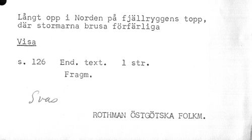 //// Långt opp i Norden på fjällryggens topp, //// där stormarna brusa förfärliga //// Visa //// s. 126 End. text. 1 str. //// Fragm. //// ROTH?^AN ÖSTGÖTSKA FOLKA4. //// ån ////