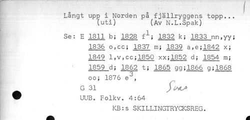 //// i //// Långt upp i Norden på fjällryggens topp... //// (uti) (Av N.L.Spak) //// Se: E 1811 b; 1828 f^*; 1832 k; 1833 nn,yy; //// 1836 o,cc; 1837 m; 1839 a,e;1842 x; //// 1849 l,v,cc;1850 xx;1852 d; 1854 m; //// 1859 d; 1862 t; 1865 gg;1866 g;1868 //// 3 //// oo; 1876 e , //// G 31 //// ^ UUB. Folkv. 4:64 //// KB:s SKILLINGTRYCKSREG. ////
