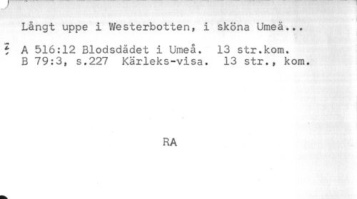 //// Långt uppe i Westerbotten, i sköna Umeå... //// t A 516:12 Blodsdådet i Umeå. 13 str.kom. //// B 79:3, s.227 Kärleks-visa. 13 str., kom. //// RA ////