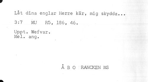 //// Låt dina englar Herre kär, mig skydda... //// 3:7 MU R5, 186, 46. //// Uppt. Wefvar. //// Mel. ang. //// //// /ÅBO RANCKEN MS ////