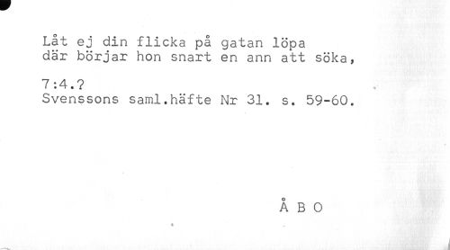 //// Låt ej din flicka på gatan löpa //// där börjar hon snart en ann att söka, //// 7:4.? //// Svenssons saml.häfte Nr 31. s. 59-60. ////