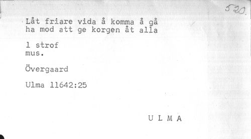 //// Låt friare vida å komma å gå //// ha mod att ge korgen åt alla ! //// 1 strof //// mus. //// * * //// Overgaard //// Ulma 11642:25 //// U L M A ////