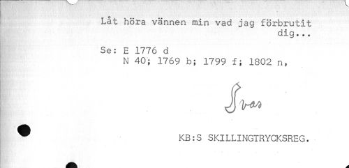 //// Låt höra vännen min vad jag förbrutit //// dig... //// Se: E 1776 d //// N 40; 1769 b; 1799 f; 1802 n, //// - //// - //// ^ KB:S SKILLINGTRYCKSREG. ////