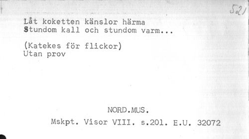 //// Låt koketten känslor härma //// Stundom kall och stundom varm... //// (Katekes för flickor) //// Utan prov //// . //// t //// NORD.MUS. //// Mskpt. Visor VIII. s.201. E.U. 32072 ////