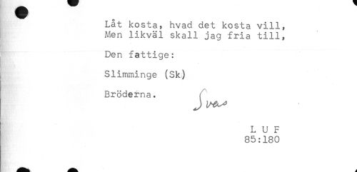 //// Låt kosta, hvad det kosta vill, //// Men likväl skall jag fria till, //// Den fattige: //// Slimminge (Sk) //// Bröderna. //// J //// L U F //// 85:180 ////