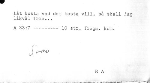 //// Låt kosta vad det kosta vill, så skall jag //// likväl fria... //// A 33:7 ---- 10 str. fragm. kom. //// J //// R A ////
