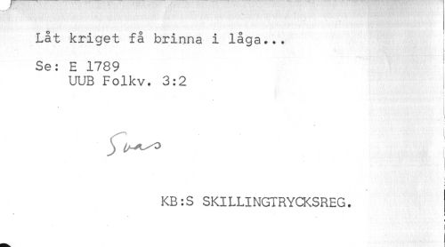 //// Låt kriget få brinna i låga... //// Se: E 1789 //// UUB Folkv. 3:2 //// ! //// t //// - //// KB:S SKILLINGTRYCKSREG. //// ) ////