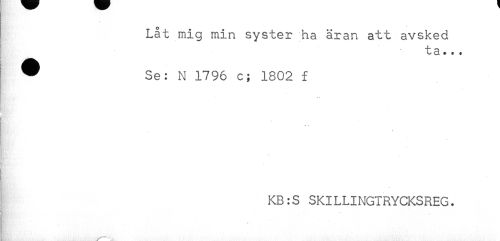 //// ( //// HM,'.;,' //// Låt mig min syster ha äran att avsked //// { ^ 3 * * //// ^ Se: N 1796 c: 1802 f //// . //// . //// KB:S SKILLINGTRYCKSREG. ////