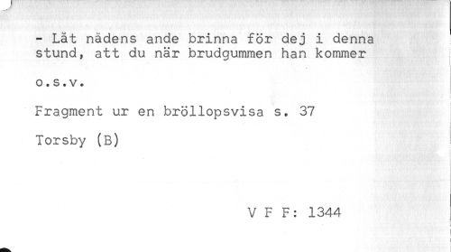 //// - Låt nådens ande brinna för dej i denna //// stund, att du när brudgummen han kommer //// o. s. v. //// < //// ! //// t //// Fragment ur en bröllopsvisa s. 37 //// Torsby (B) //// V F F: 1344 //// i //// ! //// < //// ) ////