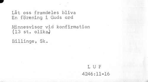 //// Låt oss framdeles bliva //// En förening i Guds ord //// Minnesvisor vid konfirmation //// (13 st. olikaj //// Billinge, Sk. //// L U F //// 4246:11-16 ////