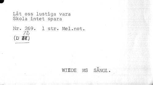 //// Låt oss lustiga vara //// Skola intet spara //// Nr. 269. 1 str. Mel.not. //// 73 //// (D %%) //// i-—— //// * //// WIEDE MS SÅNGL. ////