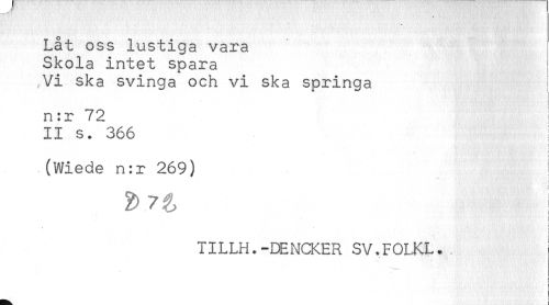 //// Låt oss lustiga vara //// Skola intet spara //// Vi ska svinga och vi ska springa //// t //// n:r 72 //// II s. 366 //// t //// i //// (Wiede n:r 269) //// ! //// t //// t //// i ////
