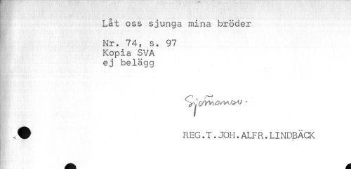 //// Låt oss sjunga mina bröder //// Nr. 74, s. 97 //// Kopia SVA //// ej belägg //// ,V REG.I.JOH.ALFR.LINDBÄCK ////