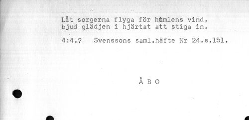 //// - - - - //// Låt sorgerna flyga för himlens vind, //// bjud glädjen i hjärtat att stiga in. //// 4:4.? Svenssons saml.häfte Nr 24.s.151. //// o //// A B O ////