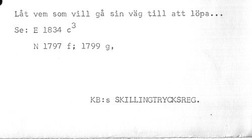 //// Lat vem som vill gå sin väg till att löpa... //// Se: E 1834 c^ //// N 1797 f; 1799 g, //// KB:s SKILLINGTRYCKSREG. ////