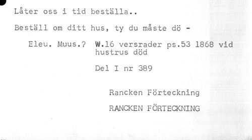 //// Låter oss i tid beställa.. //// Beställ om ditt hus, ty du måste dö - //// Eleu. Muus.? W.16 versrader ps.53 1868 vid //// hustrus död //// Del I nr 389 //// Rancken Förteckning //// RANCKEN FÖRTECKNING ////