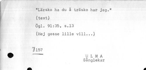 //// "Lärsko ha du å träsko har jag." //// (text) //// Ögl. 91:35, s.13 //// (Hej gosse lille vill...) //// * r? - //// n ^157 //// ! Sånglekar ////