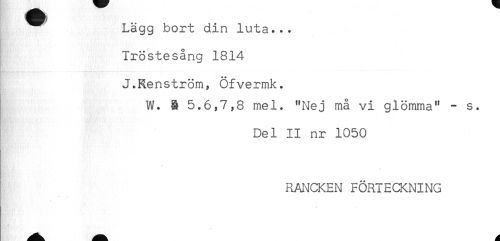 //// Lägg bort din luta... //// Tröstesång 1814 //// J.Renström, Öfvermk. //// W. § 5.6,7,8 mel. "Nej må vi glömma" - s. //// Del II nr 1050 //// t! //// RANCKEN FÖRTECKNING ////
