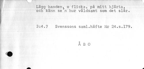 //// Lägg handen, o flicka, på mitt hjärta, //// och känn se'n hur våldsamt som det slår. //// Kf _ . . //// 3:4.? Svenssons saml.häfte Nr 24.s.179. //// ÅBO //// # ////