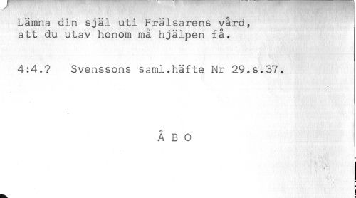 //// Lämna din själ uti frälsarens vård, //// att du utav honom må hjälpen få. //// 4:4.? Svenssons saml.häfte Nr 29,s.37. //// * //// ÅBO ////