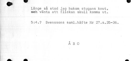 //// Länge så stod jag bakom stugans knut, //// eeh vänta att flickan skull komma ut. //// ! //// . //// 5:4,? Svenssons saml.häfte Nr 27.s.35-36. //// '-T" //// ÅBO //// ill ^HL ////