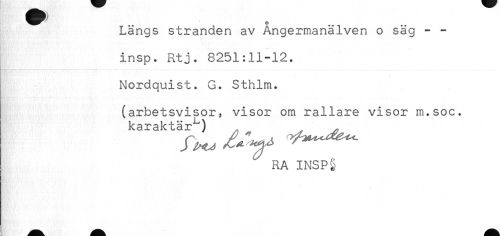 //// Längs stranden av Ångermanälven o säg - - //// insp. Rtj, 8251:11-12. //// Nordquist. G. Sthlm. //// (arbetsvisor, visor om rallare visor m.soc. //// karaktär^) //// RA INSP§ ////