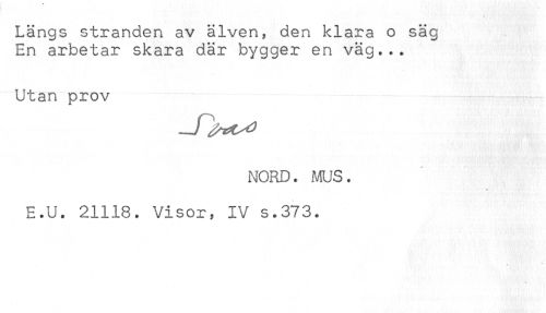 //// Längs stranden av älven, den klara o säg //// En arbetar skara där bygger en väg... //// Utan prov //// NORD. MUS. //// E.U. 21118. Visor, IV s.373. ////