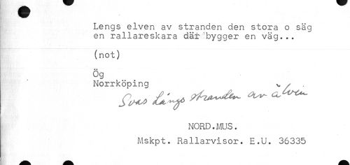 //// Lengs elven av stranden den stora o säg //// en rallareskara där bygger en väg... //// (not) //// Ög //// Norrköping ^ //// /
