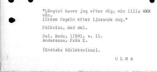 //// j "Längtat haver jag efter dig, min lilla //// vän, //// liksom fogeln efter ljusande dag." //// Folkvisa, med mel. //// Dal. Boda, 11591, s. 11. //// Andersson, Fräs E. //// (Enstaka kärleksvisor). ////