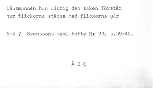 //// Länsmannen han aldrig den saken förstår //// hur flickorna städse med flickorna går //// 6:4 ? Svenssons saml.häfte Nr 23. s.39-40. //// ÅBO ////