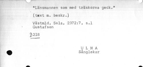 //// "Länsmannen som med träskorna geck." //// < //// (tsxt m. beskr.) //// Rf!*!'''' % //// Västmld, Sala, 2372:7, s.l //// Gustafson //// 2)218 //// U L M A //// ^^ Sånglekar //// - ////