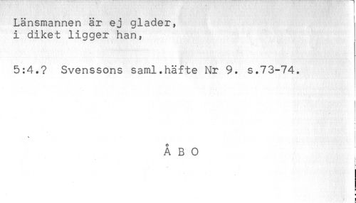 //// Länsmannen är ej gläder, //// i diket ligger han, //// 5:4.? Svenssons saml.häfte Nr 9. s.73-74. //// t //// - //// ! //// ! //// f //// i //// < //// O //// A B O //// t. //// ! //// H //// < //// ! ////