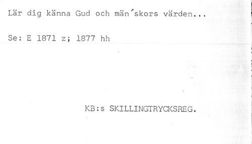 //// Lär dig känna Gud och män''skors värden... //// Se: E 1871 z; 1877 hh //// ! //// L //// h //// ) //// i //// i //// t //// i //// ? //// KB:s SKILLINGTRYCKSREG. ////
