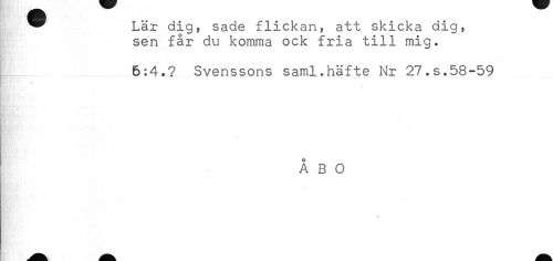 //// * Lär dig, sade flickan, att skicka dig, //// sen får du komma ock fria till mig. //// . 6:4.? Svenssons saml.häfte Nr 27.s.58-59 //// ÅBO ////