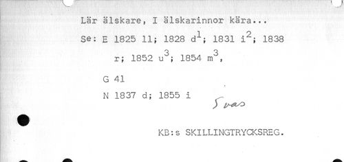 //// Lär älskare, I älskarinnor kära... //// Se: E 1825 11; 1828 d^; 1831 i^; 1838 //// r; 1852 u^; 1854 m^, //// G 41 //// N 1837 d; 1855 i //// I' ' ^jj^jjjj^j^ //// KB:s SKILLINGTRYCKSREG. //// Ka ' * //// n - * * ////