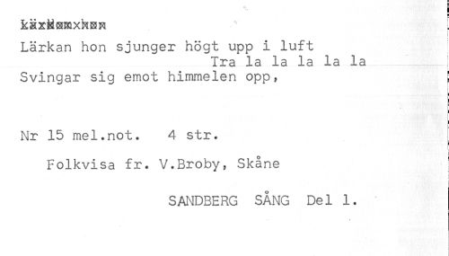 //// S //// RäxMEmxhEH [ //// < //// < //// i //// < //// Lärkan hon sjunger högt upp i luft //// Ira la la la la la //// Svingar sig emot himmelen opp, j! //// ! //// i //// i //// .t //// Nr 15 mel.not. 4 str. //// Folkvisa fr. V.Broby, Skåne ! //// ! //// i //// r //// SANDBERG SÅNG Del 1. //// ! ////