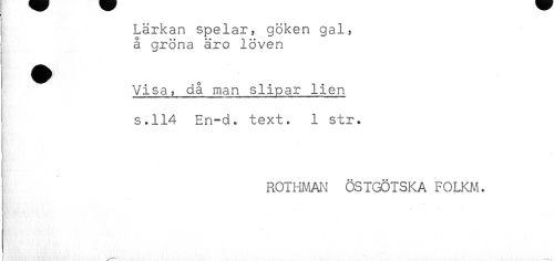//// Lärkan spelar, göken gal, //// å gröna äro löven //// ^ Visa, då man slipar lien //// s.114 En-d. text. 1 str. //// ROTHMAN ÖSTGÖTSKA FOLKM. ////