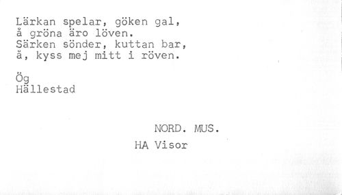 //// Lärkan spelar, göken gal? //// å gröna äro löven. //// Särken sönder, kuttan bar, //// å, kyss mej mitt i röven. //// < * //// Og //// Hällestad //// NORD. ms. //// HA Visor ////