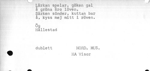 //// Lärkan spelar, göken gal //// å gröna äro löven, //// Särken sönder, kuttan bar //// å, kyss mej mitt i röven. //// +* //// og //// Hällestad //// dublett NORD. MUS. //// ^ HA Visor ////